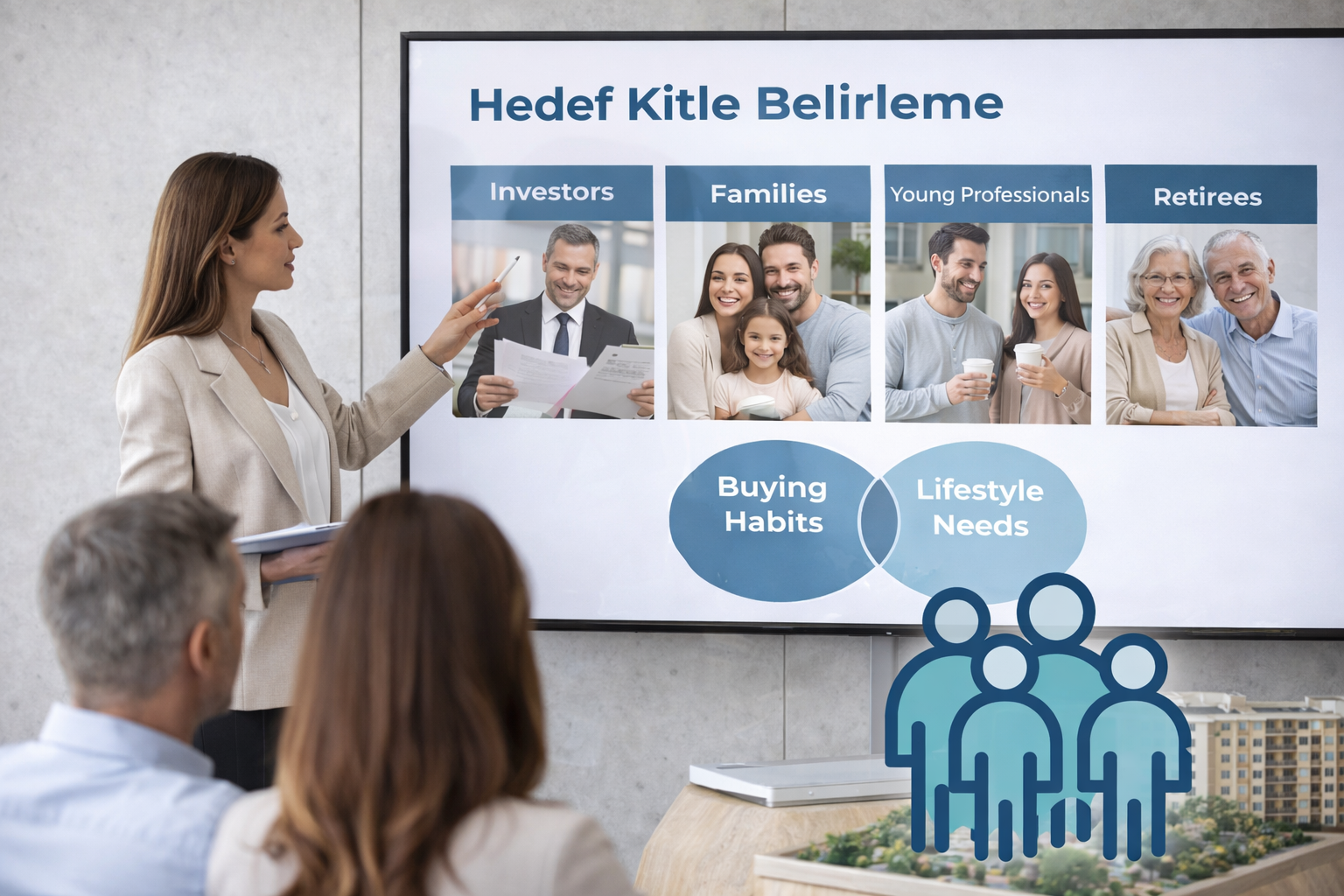 Projeye en uygun yatırımcı ve kullanıcı profili belirlenir. Hedef kitlenin yaşam beklentileri, satın alma alışkanlıkları ve yatırım tercihleri analiz edilerek proje buna göre şekillendirilir.